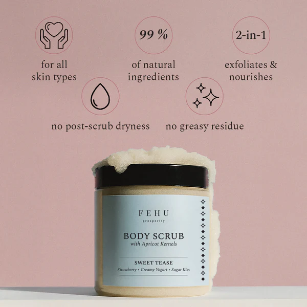 De scrub verwijdert dode huidcellen, egaliseert ruwe plekken en voedt de huid intens tijdens het gebruik. De olieachtige textuur smelt op de huid, waardoor deze na het afspoelen direct zacht, soepel en gehydrateerd aanvoelt — zonder vettige resten en zonder dat een crème nodig is.