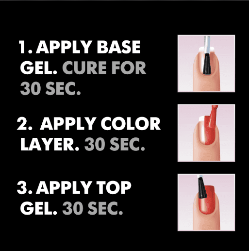 Breng de Salon Effect Gelpolish aan over de basislaag. Uitharden in elke lamp gedurende 30 seconden. Breng indien nodig een tweede laag aan, gellakken zijn sterk gepigmenteerd, maar we raden aan een tweede laag aan te brengen voor lichte en nude tinten. Daarna opnieuw uitharden in een lamp gedurende 30 seconden.