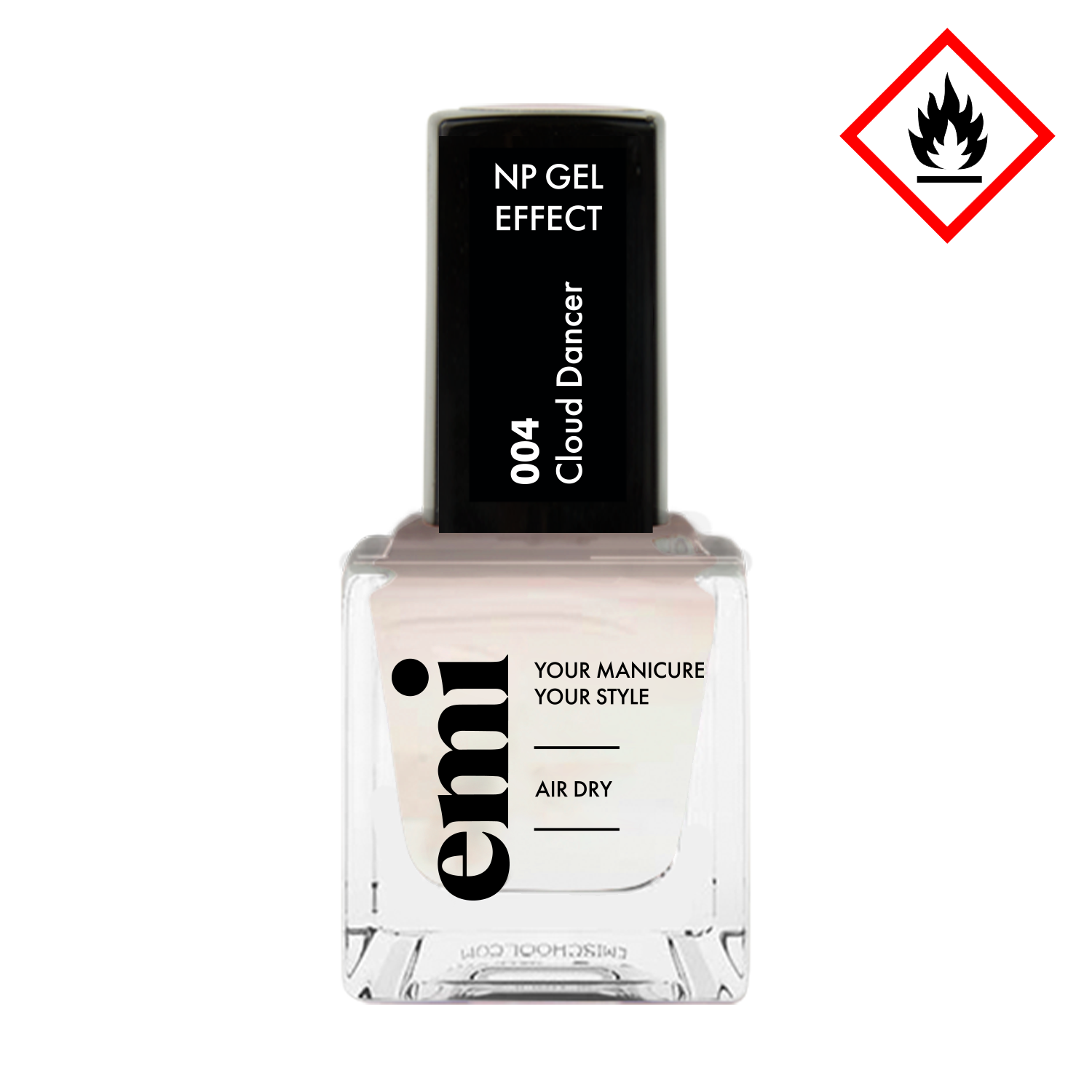 E.Mi Cloud Dancer 004 is een elegante nude nagellak met gel-effect. Droogt in 10 minuten zonder lamp en blijft tot 10 dagen perfect glanzen.